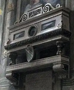 Nótese que el contrato final con delle Croci fue en 1516[note 14] mientras que Cairano murió en 1517:[67] si Cairano efectivamente trabajó en el monumento, se puede deducir de los documentos que no habría tenido tiempo suficiente para terminarlo completamente dentro del plazo, y en consecuencia una gran parte del mismo debía haber sido hecho antes de esta fecha.[note 15] Esto significa admitir la participación de Cairano antes de 1516, lo que no está atestiguado en los documentos.[note 16][68] En efecto, el mismo contrato de 1516 afirma que la obra estaba incompleta cuando se instaló en la iglesia; se desconoce cuál era su estado en ese momento; y los restos de Bernardino Martinengo ya estaban alojados en él desde el año anterior. La implicación es que el progreso del monumento pudo haber estado casi terminado, al menos en la estructura y los componentes arquitectónicos.[69] El carácter incompleto al que aluden los documentos de 1516 se refiere probablemente a los insertos decorativos de diversa índole, incluidos los bronces que se deben definitivamente a della Croci[70]