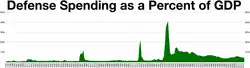 En 2016 gastó el 3,29 % de su PIB, más que el 2,26 % de Francia y menos que el 9,85 % de Arabia Saudita.[49] Esto es históricamente bajo para los Estados Unidos, desde que alcanzó su punto máximo en 1944 con el 37,8% del PIB y cercano al punto más bajo del 3,0% en 2000). Incluso durante el apogeo de la guerra de Vietnam, el porcentaje alcanzó un máximo del 9,4 % en 1968.[50]