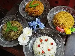 El arroz se sirve generalmente con cada comida acompañada de un guiso que se vierte sobre el arroz. El té se consume generalmente en todo momento del día con o sin comidas, solo o como una bebida social. El queso, las galletas saladas, los bizcochos, los baklawa u otros bocadillos a menudo se sirven junto con el té como aperitivos. Se pueden aplicar restricciones dietéticas durante la Cuaresma en la que ciertos tipos de alimentos no se pueden consumir; A menudo significa derivado de animales.[1][2]