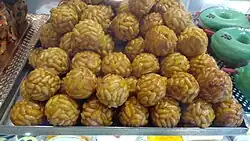 Pollo o pavo relleno, de ciruelas pasas (o de orejones) y piñones, y cocido en una cazuela de barro.