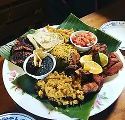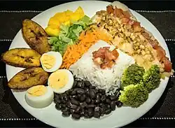 Uno de los platos más representativos del país es el gallo pinto, conocido simplemente como pinto, patrulla o burra, en algunos pueblos sureños. Su origen se remonta a la época colonial y se le considera un plato mestizo que tiene una fuerte influencia africana, formando parte de las muchas recetas americanas hechas a base de arroz y frijoles.[62] Además de estos dos granos básicos, se le agregan diversos condimentos, entre los que se pueden citar cebolla, chile dulce y culantro. Posee variantes según la región: más grasoso y tostado en Guanacaste; y más húmedo en el Valle Central. En la provincia de Limón, preparado con frijoles rojos, leche de coco y chile panameño, recibe el nombre de rice and beans.[62]
