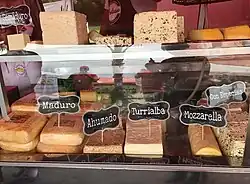 De los quesos meseteños el más conocido es el Turrialba, que posee denominación de origen. Es blanco, fresco y prensado; elaborado a base de leche entera, posee un aroma tenue, consistencia firme y homogénea, no tiene sal ni maduración, por lo que su sabor es muy suave, y no se derrite pero se puede freír, suele presentarse en bloques grandes y uniformes o en ruedas.[33] Este queso se originó entre mediados y finales del siglo xix, producido en conjunto por colonos costarricenses e inmigrantes españoles provenientes de La Mancha que se asentaron en las montañas del cantón de Turrialba, localidad de la que toma su nombre el queso.[34] Por lo tanto, al ser un producto con protección de origen, se elabora exclusivamente en los distritos turrialbeños de Santa Cruz y Santa Teresita, en la provincia de Cartago.[35] Debido a sus características organolépticas y versatilidad es muy frecuente que se consuma con pan baguette, gallo pinto, dulces de fruta y café.