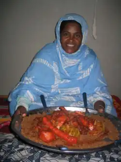 La gastronomía de Mauritania incluye las prácticas culinarias del país africano. Históricamente, lo que ahora es Mauritania ha sido influenciado por pueblos árabes y africanos que han vivido y atravesado el "marcado" paisaje enmarcado con dunas del desierto del Sahara en caravanas.[1] Existe una superposición con la cocina marroquí en el norte y la cocina senegalesa en el sur. La influencia colonial francesa (Mauritania fue una colonia hasta 1960) también ha desempeñado un papel importante en la cocina de una tierra relativamente aislada. El alcohol está prohibido en la fe musulmana y su venta se limita en gran medida a los hoteles.[2] El té de menta se consume ampliamente y se vierte desde lo alto para crear espuma. Tradicionalmente, las comidas se consumen de forma comunal.[3]