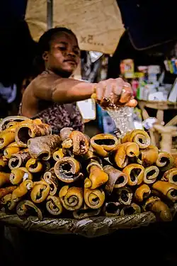 - Dundu, rodajas de ñame asadas o fritas. Puede freírse en aceite de palma o aceite vegetal; se agrega agua para ablandar el ñame mientras se cocina. El Dundu se suele comer con una salsa de maní o aceite de palma, tomates, chiles y condimentos.[5]