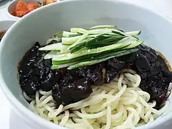 - Jajangmyeon (hangul: 자장면; chino simplificado: 炸酱面), fideos al vapor en una pasta de judía negra ligeramente condimentada, marcadamente diferentes de los diversos tipos de zhajiang mian servidos en la China continental y Taiwán.