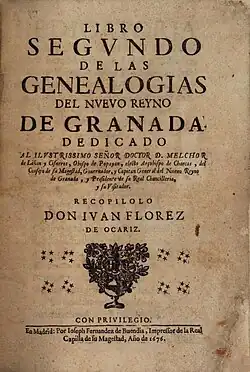 ![]() Portada de las Genalogías del Nuevo Reino de Granada. | ||