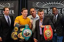 - ↑ Por los títulos de peso mediano de la AMB (Super), IBO, FIB y el título interino del CMB.