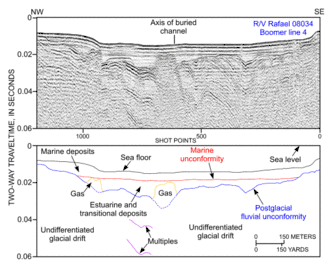 La reflexión sísmica se utiliza para obtener imágenes de capas casi horizontales en la Tierra. El método es muy parecido al eco que suena. Se puede usar para identificar pliegues y fallas, y para buscar campos de petróleo y gas. A escala regional, los perfiles se pueden combinar para obtener una estratigrafía de secuencia, lo que permite fechar las capas sedimentarias e identificar el aumento eustatico del nivel del mar.[7]