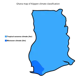El clima de Ghana es tropical monzónico, con una estación seca en invierno y una estación lluviosa en verano debida a los monzones africanos. En este contexto, se pueden distinguir cinco regiones: el norte seco del país, con lluvias de mayo a septiembre; el centro-norte, de abril a octubre; y el sur, de abril a noviembre. En el sudeste, en la desembocadura del río Volta, llueve entre abril y junio y en septiembre y octubre, con un paréntesis en julio y agosto. En cambio, en el extremo occidental, desde la frontera con Costa de Marfil hasta el cabo Tres Puntas, las lluvias, más duraderas, alcanzan los 2000 mm.