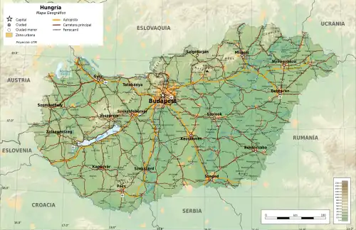 Hungría es un Estado sin litoral. Tiene una ubicación estratégica entre las principales rutas terrestres entre la Europa occidental y la península balcánica, así como entre Ucrania y la cuenca del Mediterráneo. Los ríos que fluyen de norte a sur, el Danubio y el Tisza, dividen el país en tres grandes regiones.