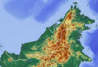 Malasia Oriental, integrada por los estados de Sarawak, Sabah y el Territorio Federal de Labuan está situada al norte de la parte indonesia de Borneo (Kalimantan) y junto al enclave del Sultanato de Brunéi. Está formada por una larga franja de tierra de 1.125 km de largo por unos 275 km de anchura. La región costera tiene de 30 a 60 km de anchura en Sarawak y de 15 a 30 km en Sabah, donde la costa es más irregular y dentada. Le sigue una región formada por colinas y valles de entre 300 y 750 m de altura, muy agreste, y por último, una región montañosa que separa el país de Kalimantan, formada por mesetas, barrancos y gargantas de entre 1.200 y 2.100 m de altura. La cadena montañosa principal está en Sabah, formada por los montes Crocker o Banjaran Crocker, que culminan en el monte Kinabalu, de 4.100 m, seguido del cercano monte Tambuyukon, de 2.579 m. Esta zona forma parte del Parque Nacional de Kinabaluy fue declarada en 2014 Reserva de la biosfera de la Unesco.[4] Esta cadena se halla en el nordeste de la isla y es paralela a la costa norte.