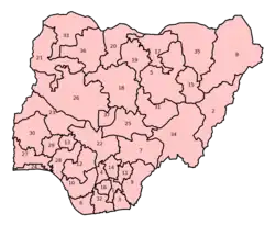 Nigeria se divide en 36 estados y un distrito federal: el Territorio Capital Federal de Abuya. A su vez los estados se dividen en Áreas de Gobierno Local (774 en total).