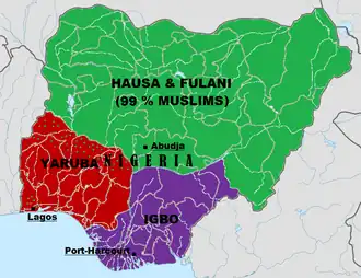 En Nigeria hay más de 250 etnias y se hablan más de 500 lenguas. Cuatro grupos étnicos constituyen el 70 % de una población muy joven, en la que el 42,5 % de sus habitantes tiene entre 0 y 14 años.[11] Hay tres grupos religiosos principales: los musulmanes forman el 50 % de la población, los cristianos el 40 %, y el animismo o creencias indígenas el 10 % restante.