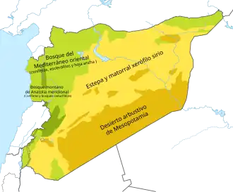 | Bosque montano de Anatolia meridional Bosque del Mediterráneo oriental Estepa y matorrales xerófilos de Siria Desierto arbustivo de Mesopotamia |
