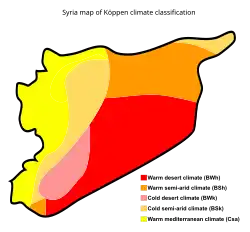La característica más llamativa del clima es el contraste. Entre la húmeda costa mediterránea y las áridas regiones desérticas se encuentra una zona de estepa semiárida que se extiende a lo largo de las tres cuartas partes del país y limita al oeste con las montañas del Líbano y las montañas an-Nusayriyah, al norte con la región montañosa turca (los Montes Tauro), y en el sureste por Jabal al Arab (o Monte Druso).