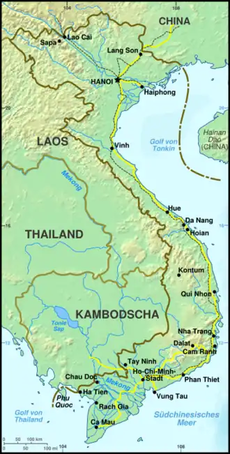 - Localización: Sudeste Asiático. Con costas en el Golfo de Tailandia, en el Golfo de Tonkín y el Mar de la China Meridional. Fronteras con Laos, Camboya y China.