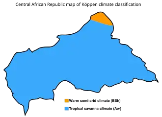 El clima de la República Centroafricana es tropical de sabana, bastante húmedo, en el norte y en los bosques del sur, con una estación seca en invierno, y una estación húmeda, más larga en el sur y más limitada en el norte. La mayor parte del país está cubierto de sabana con árboles; en el extremo norte el territorio es más seco por la proximidad del Sahel, en cambio, en el sur hay todavía bosques lluviosos.