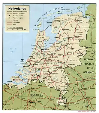 Los Países Bajos están divididos en doce provincias (provincies, singular - provincie): Holanda Meridional (cap. La Haya), Holanda Septentrional (Haarlem), Brabante Septentrional (Bolduque), Güeldres (Arnhem), Utrecht (Utrecht), Limburgo (Maastricht), Overijssel (Zwolle), Frisia (Leeuwarden), Groninga (Groninga), Drente (Assen), Zelanda (Midelburgo) y Flevoland (Lelystad).