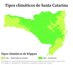 El territorio catarinense cubre dos tipos climáticos, a saber: el subtropical húmedo con veranos cálidos (Cfa) y el subtropical húmedo con veranos no muy caliente (Cfb).