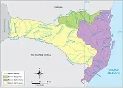 En el sertão del estado, dos cuencas se unen para que se forme la cuenca del Río de la Plata: la cuenca hidrográfica fluvial del Paraná, cuyo afluente más importante es el río Iguazú, y la cuenca del Uruguay, cuyos afluentes principales los ríos Pelotas, Canoas, Chapecó y do Peixe.[21]