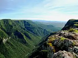A partir de entonces, la región costera más recta presenta lagunas costeras, como las de Esteves, Caverá, Sombrio y, por último, el conocido Morro dos Conventos. Es una estructura de rocas sedimentarias viejas, con bloques separados cerca del océano, con un escarpe difícil de subir. Y, en la frontera con Rio Grande do Sul, la costa tiene un segundo acantilado de bloques separados, pero Serra Geral: Torres. Sin embargo, allí comienza una segunda tierra, la tierra gaúcha.[1]