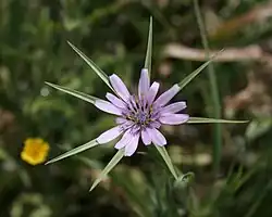 Planta anual, de 10-80 cm de alto, usualmente glabra, con tallo erecto asurcado simple o algo ramificado. Las hojas son alternas, herbáceas, estrechamente lineares, de hasta 8 mm de ancho y 18 cm de largo, las caulinares con la base ensanchada y subamplexicaule, glabras o pubescentes en sus bases. El pedúnculo floral es hueco/fistuloso e inflado por debajo del involucro, solitario, que tiene 8-9 brácteas lineares o linear-ovaladasa, acuminadas y glabras, en una sola fila, de 3 cm de largo por 2,5-3 mm de ancho y que llegan a los 2,5-3 cm de largo en la fructificación. Las lígulas, rosas hasta violetas, de 12-14 mm por 3 mm de ancho, son mucho más cortas que las brácteas involucrales. Las cipselas, de cuerpo estrechamente fusiforme y asurcado son dimórficas: las internas fuertemente surcadas por 10 costillas y con un fino pico coronado por un vilano de 20 pelos plumosos, mientras las externas, lo tienen de 5 pelos escabridos desiguales.[1] [2]