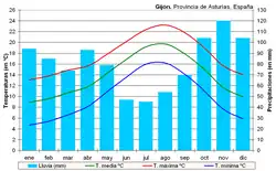 El clima de Gijón, determinado por la presencia del mar y la baja altitud del concejo, es un clima oceánico, con abundantes precipitaciones desde el otoño hasta los primeros días de la primavera, y un tiempo más estable y cálido en verano. Según los datos ofrecidos por la Agencia Estatal de Meteorología para la estación meteorológica de Gijón (período 1971-2000), la media del mes más frío (enero) fue de 8,9 °C, la media del mes más cálido (agosto) fue de 19,7 °C y la temperatura media anual es de 13,8 °C (media anual de máximas: 17,6 °C; media anual de mínimas: 9 °C).[23] La nieve cubre ocasionalmente en el invierno los montes del concejo que rodean la ciudad y llega de forma esporádica al centro de la ciudad, con una media de un día de nieve anual.