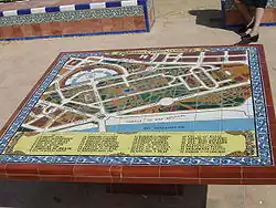 Es de planta cuadrada, con cuatro bancos de obra esquineros alrededor de una mesa. La "mesa mural" tiene un plano de la Exposición Iberoamericana de 1929 realizado de cerámica.[1] Esta exposición abarcaba todo el parque y las calles cercanas.