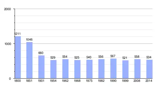 Los datos demográficos contemplados en este gráfico de la comuna de Glos-la-Ferrière[4] se han cogido de 1800 a 1999 de la página francesa EHESS/Cassini, y los demás datos de la página del INSEE.[5]