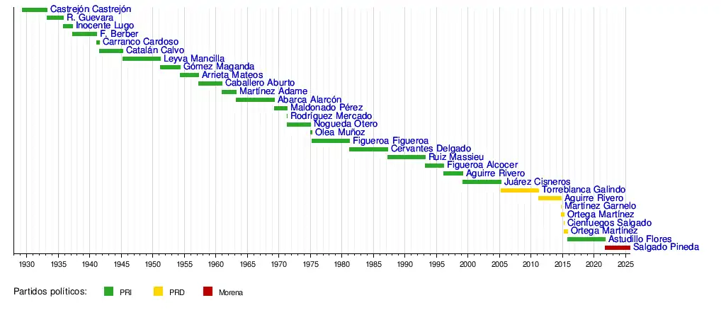 Con la fundación del Partido Nacional Revolucionario (hoy Partido Revolucionario Institucional) en 1929 todos los gobernadores provinieron de este partido, hasta que en las elecciones del 6 de febrero de 2005, el perredista Carlos Zeferino Torreblanca Galindo, derrotó al candidato del PRI y en las elecciones del 30 de enero de 2011 ganó el actual gobernador Ángel Aguirre Rivero con la coalición Guerrero nos Une conformada por el PRD, PT, Convergencia y en último momento el PAN se unió cediéndole al candidato sus votos. Con la llegada de Héctor Antonio Astudillo Flores, el Partido Revolucionario Institucional recupera dicho espacio gubernativo. quien era el presidente de Santa Cruz Guerrero Huamuxtitlan.