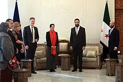 Tras la caída de Bashar al-Assad, los gobiernos de Egipto, Irak, Arabia Saudita, Emiratos Árabes Unidos, Jordania, Baréin, Omán, Turquía, Italia y Francia reanudaron sus misiones diplomáticas en Siria.[61] El nuevo gobierno se reunió con diplomáticos de Francia, Alemania, el Reino Unido y la Unión Europea en los días inmediatamente posteriores a la caída del régimen de al-Assad.[62] Se reunieron con diplomáticos de Estados Unidos el 20 de diciembre de 2024.[63]