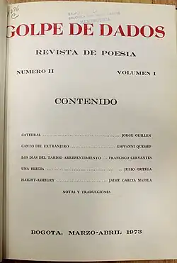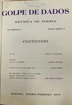 El primer número aparece en enero de 1973. Estaba dedicada completamente al género lírico, aun cuando la gran mayoría de los textos publicados eran de autores colombianos, la revista se posicionaba como un gran faro para visibilizar a las nuevas manifestaciones poéticas en Hispanoamérica y Latinoamérica, especialmente. En este primer número aparece el editorial a cargo de Fernando Charry Lara, donde plantea el ethos del grupo que estaba detrás de la revista y que precisamente no se podría observar como un grupo, en palabras de James J. Alstrum de la Universidad de Illinois, en el libro: La generación desencantada de Golpe de Dados: los poetas colombianos de los años 70, publicado por la Universidad Central en el año 2000, dice: