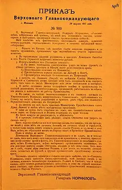 Pareciendo, no obstante, el hombre adecuado para realizar las reformas militares consideradas necesarias y más moderado[18][15] que sus colegas, favorable a la implantación de medidas draconianas, pero con inclinaciones demócratas y con el favor de Borís Sávinkov[15] —comisario del frente suroccidental donde servía Kornílov, cercano a Kérenski y a punto de asumir el cargo de viceministro de Defensa[19][20][18]—, tomó posesión como comandante en jefe el 19 de juliojul./ 1 de agosto de 1917greg.,[21][22][19] relevando a Brusílov,[23][24] aunque Kérenski pronto se planteó destituirlo[24] al exigir el general unas condiciones para aceptar el nombramiento que podían conllevar su independencia del Gobierno.[13][20][18] El gabinete, sin embargo, decidió respaldar a Kornílov a pesar de las dudas de Kérenski.[13][19][20] Para entonces era plenamente conocida su escasa simpatía por la revolución y sus tratos con elementos conservadores.[25] Estos consideraron el nombramiento de Kornílov como un paso político hacia la implantación de un futuro Gobierno autoritario y mostraron su satisfacción.[17] Al ser nombrado para el puesto, Kornílov declaró que solo respondería ante su conciencia y ante «el pueblo»[18][24] y que no permitiría la injerencia en las operaciones militares del Gobierno o de los consejos; sus relaciones con el gabinete, especialmente con los ministros socialistas, fue tensa desde el principio.[19] Sávinkov y Filonenko, sin embargo, lograron convencer[15] al primer ministro y al nuevo comandante en jefe de que su cooperación era necesaria para restaurar la disciplina militar y la autoridad gubernamental.[18] Para Kérenski, Kornílov parecía un hombre decidido, era muy popular entre la derecha política cuyo respaldo necesitaba para apuntalar su posición y era una de las escasas opciones entre los mandos veteranos del Ejército, en su mayoría reaccionarios y hostiles al primer ministro.[24] Sávinkov y Filonenko —nombrado comisario gubernamental ante el alto mando— debían moderar a Kornílov como ya habían logrado en el primer enfrentamiento a propósito de su nombramiento y permitir al primer ministro controlar al general.[24]