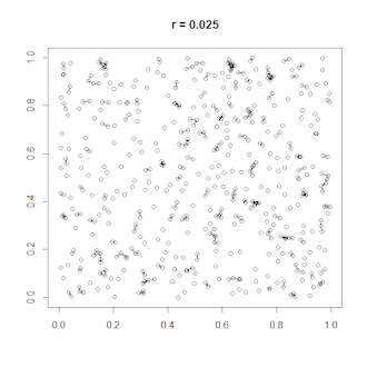 Un grafo geométrico aleatorio (GGA) es un grafo geométrico no direccionado con nodos aleatoriamente muestreados a partir de una distribución uniforme en un espacio subyacente .[3] Dos vértices p, q ∈ V están conectados si y solo sí, su distancia es menos que la previamente especificada mediante el parámetro r ∈ (0,1), excluyendo cualquier bucle. Así, los parámetros r y n carateriza íntegramente a una GGA.