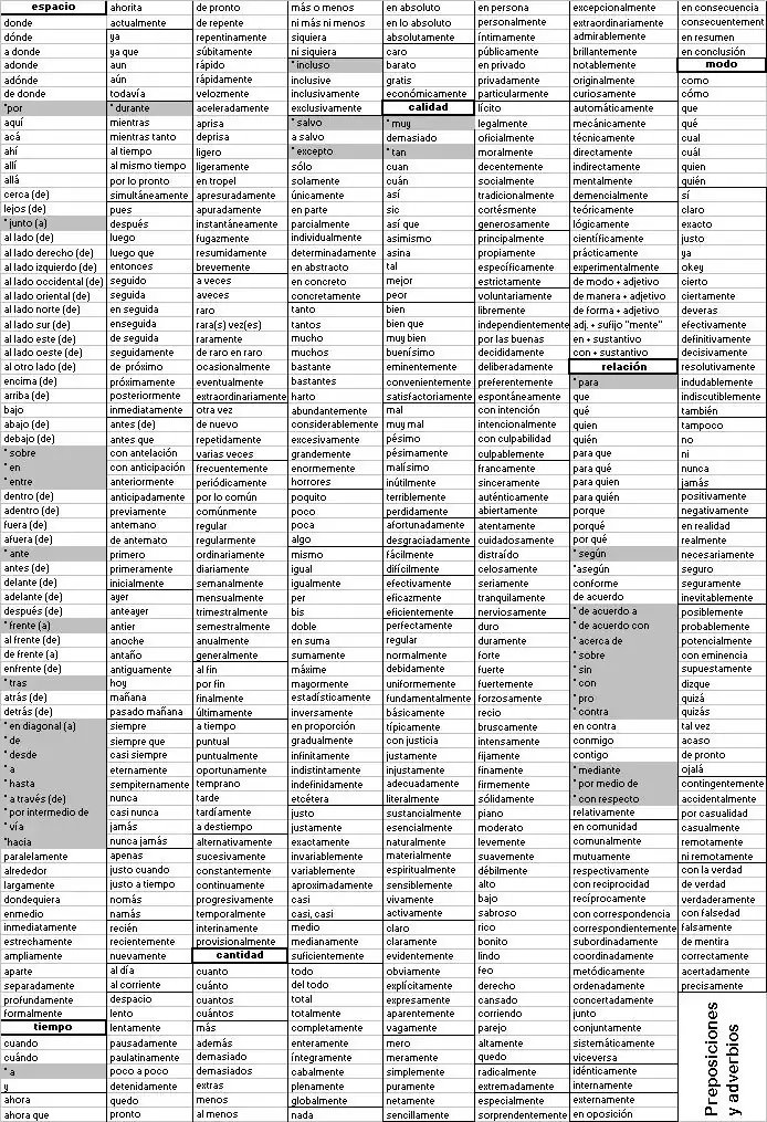 - Instrumento, adverbio de modo, adverbios fuertes (de tiempo o lugar).