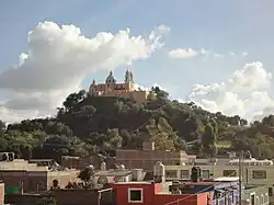 Vista norte de la Pirámide de Cholula con el Santuario de la Virgen de los Remedios