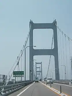 Es el primer puente colgante triple del mundo, y su longitud total es de 4.105 m. La zona central está atravesada por la Autovía de Nishiseto; también tiene un carril norte exclusivo para peatones y ciclistas, y un carril sur exclusivo para motociclistas.