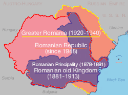 El concepto de "Gran Rumanía" se materializó como una realidad geopolítica después de la Primera Guerra Mundial.[12] Rumania ganó el control de Besarabia, Bucovina y Transilvania. Las fronteras establecidas por los tratados que concluyeron la guerra no cambiaron hasta 1940. El estado resultante, a menudo denominado "România Mare" o, alternativamente, en rumano: România Întregită, fue visto como el 'verdadero', todo el estado rumano, o, como dice Tom Gallagher, el "Santo Grial del nacionalismo rumano".[21] Su constitución, proclamada en 1923, "ignoró en gran medida las nuevas realidades étnicas y culturales".[22]