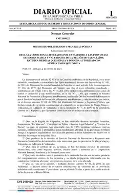 - ↑ Gabriel Boric Font [@GabrielBoric] (11:34 p. m. · 2 feb. 2024). «Hemos decidido adelantar el COGRID a las 1230 am. La situación de los incendios forestales especialmente en la 5ta región es muy difícil por las temperaturas y vientos, pero sepan que estamos con Gobierno, Bomberos, Conaf, Carabineros y sociedad civil desplegados al máximo de las capacidades para enfrentar la emergencia. He decido además decretar Estado de excepción por catástrofe para disponer de todos los recursos necesarios.» (tuit) – vía X/Twitter.