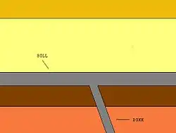 Los diques son habitualmente sub-verticales a verticales. Cuando el magma que fluye hacia arriba (formando el dique) se encuentra con límites horizontales o debilidades, como entre las capas en un depósito sedimentario, el magma puede fluir horizontalmente creando una lámina. Algunas provincias de estas láminas tienen áreas de más de 1000 km.[18]
