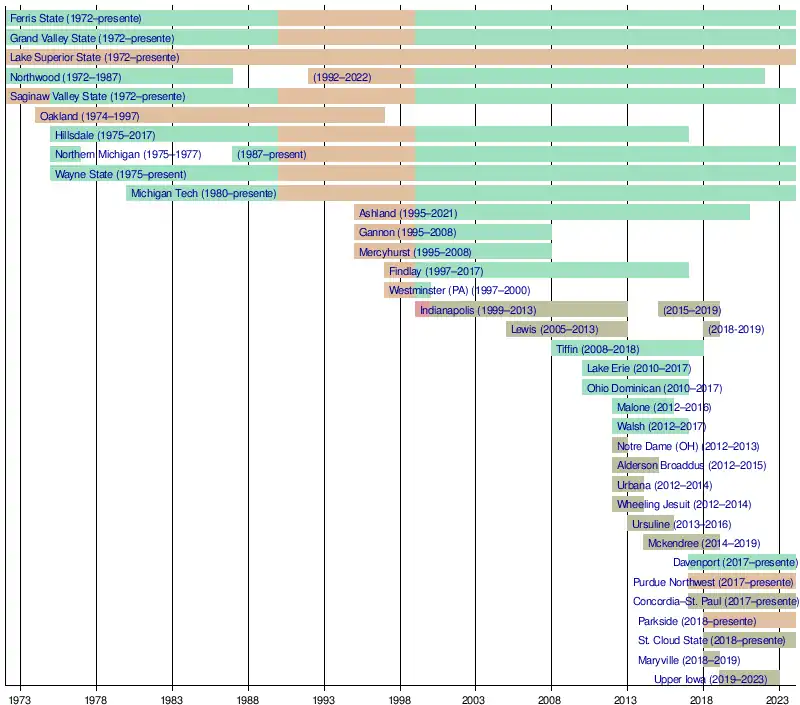 - ↑ «GLIAC Membership History». Great Lakes Intercollegiate Athletic Conference. Consultado el 29 de octubre de 2011.