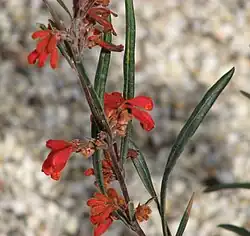 Crece alcanzando un tamaño de entre 0,5 y 1,8 metros de altura y tiene hojas elípticas a lineares. Estas miden de 40 a 120 mm de largo y 2 a 10 mm de ancho y tienen los márgenes recurvados. Las flores son rojas y se producen entre junio y noviembre en su rango nativo. Estas son seguidas por frutos ovoides de 15 mm de largo.
