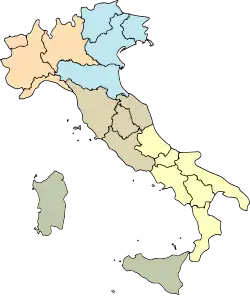 El Instituto Nacional de Estadística Italiano (del italiano: Istituto Nazionale di Statistica) utiliza las siguientes divisiones (del italiano: ripartizioni) geográficas en el censo.