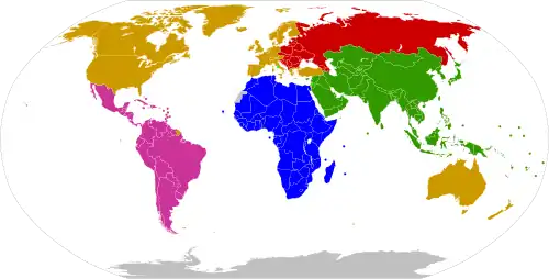 Los Estados miembros de las Naciones Unidas extraoficialmente se dividen en cinco grupos regionales geopolíticos. Lo que comenzó como un medio informal de intercambio de la distribución de los puestos de comisiones de la Asamblea General ha adoptado un papel mucho más amplio. Dependiendo del contexto de la ONU, los grupos regionales controlan las elecciones a puestos relacionados con las Naciones Unidas, sobre la base de la representación geográfica, así como coordinan la política sustantiva y forman frentes comunes para las negociaciones y las votaciones.
