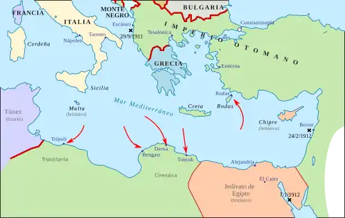 En 1911, la opinión pública italiana, atizada por los nacionalistas y la banca, clamaba por la guerra contra el Imperio otomano, que parecía rechazar toda iniciativa italiana en las provincias de Tripolitania y Cirenaica.[8] Estas dos provincias,[nota 1] las últimas posesiones otomanas en África,[10] estaban gobernadas directamente por Constantinopla desde 1835.[11][9][12] Contaban con una población aproximada de algo más de medio millón de habitantes, principalmente árabes, aunque también moraban en ella bereberes, grupos de raza negra y escasas colonias de turcos y occidentales.[13][nota 2] El Reino Unido dominaba el comercio exterior de la región, que era escaso con Italia.[14] Esta región era el centro de la agitación nacionalista desde la derrota en la batalla de Adua de 1896, que deseaba que sirviese para encauzar la emigración y ampliar el Imperio colonial italiano.[15] El propio Gobierno había fomentado el fervor colonialista mediante diversas medidas (patrocinio de conferencias, fundación de un departamento colonial, impresión de textos que justificaban la anexión de los territorios libios otomanos, etc.).[16] Debía servir además de revancha por la ocupación francesa de Túnez, sometido al protectorado del país vecino desde 1881 (Tratado del Bardo).[17] El territorio era una pieza más del plan italiano para controlar el Mediterráneo mediante la adquisición de territorios en África septentrional.[18]