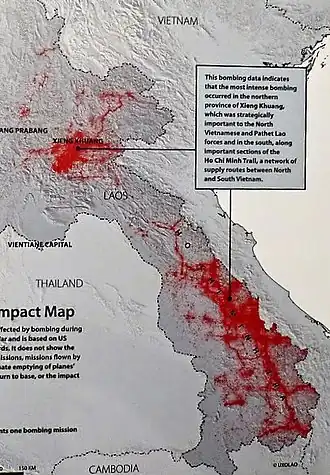 Laos fue el país más bombardeado del planeta. En total, EE. UU. lanzó dos millones de toneladas de explosivos sobre Laos, entre ellos 270 millones de bombas de racimo, contenedores de unas 670 minas antipersona cada una. Se calcula que 80 millones de submuniciones no explotaron pero siguen activas. Al menos 50.000 civiles murieron durante la guerra como consecuencia de los bombardeos aéreos y otros 20.000 han muerto o quedaron mutilados desde el final de la guerra, a causa de las bombas sin explotar.[13]