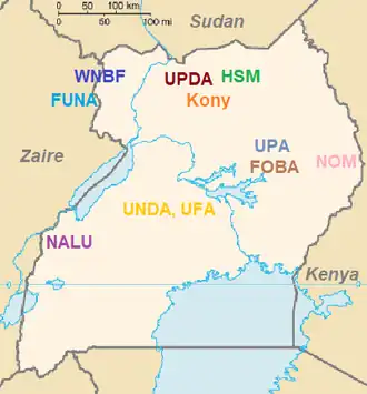 Las facciones insurgentes más importantes fueron el Ejército Democrático del Pueblo de Uganda (UPDA), el Ejército del Pueblo de Uganda (UPA), el Movimiento del Espíritu Santo (HSM) de Alice Auma y el ejército de Joseph Kony (que más tarde se convirtió en el Ejército de Resistencia del Señor). Varias facciones rebeldes más pequeñas y grupos escindidos de los movimientos más grandes libraron sus propias campañas. Los rebeldes a menudo chocaban entre sí. Todos los beligerantes, incluido el gobierno, atacaron a civiles y cometieron violaciones de derechos humanos. En el transcurso de combates que involucraron a decenas de miles de tropas, el gobierno de Uganda pudo derrotar o contener gradualmente a la mayoría de las facciones rebeldes. Las operaciones en el norte y el este causaron gran destrucción y provocaron un gran número de víctimas civiles.