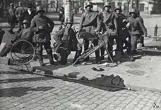 El 5 de marzo, un escuadrón naval germano desembarcó en las islas Åland, en el archipiélago meridional de Finlandia, donde una expedición militar sueca protegía los intereses finlandeses y la población suecófona desde mediados de febrero.[50] El 3 de abril, los 10 000 soldados de la División del Mar Báltico, al mando de Rüdiger von der Goltz, atacaron Hanko, al oeste de Helsinki. El 7 de abril, los 3000 miembros del Destacamento Brandenstein superaron la ciudad de Loviisa en la costa sureste. Las principales formaciones alemanas avanzaron rápidamente al este, desde Hanko, y tomaron Helsinki el 13 de abril. Esa misma fecha, una flotilla formada por dos acorazados alemanes y varias embarcaciones de menor calado entraron en el puerto y bombardearon las posiciones rojas, que incluían el Palacio Presidencial. La Brigada Brandenstein atacó Lahti el 19 de abril, partiendo en dos el territorio rojo. La División del Mar Báltico avanzó hacia el norte desde Helsinki, conquistando Hyvinkää y Riihimäki el 21 y 22 de abril, respectivamente, para después capturar Hämeenlinna el 26. La eficiente actuación de los principales destacamentos alemanes en la guerra civil contrastaba notablemente con la de las desmoralizadas tropas rusas.[51]