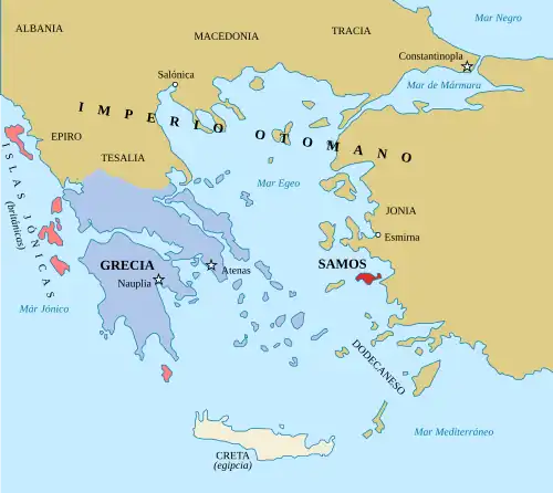 Grecia había estado bajo el dominio otomano desde el siglo XV, en las décadas anteriores y posteriores a la caída de Constantinopla.[1] Durante los siglos siguientes, ocurrieron insurrecciones griegas esporádicas pero infructuosas contra el dominio otomano.[2] En 1814, se fundó una organización secreta llamada Filikí Etería (Sociedad de Amigos) con el objetivo de liberar Grecia, alentada por el fervor revolucionario que se apoderaba de Europa en ese período. La Filikí Etería planeaba lanzar revueltas en el Peloponeso, los principados del Danubio y la propia Constantinopla. La insurrección fue planeada para el 25 de marzo de 1821 (en el calendario juliano), el día de la Fiesta de la Anunciación para los cristianos ortodoxos. Sin embargo, los planes de la Filikí Etería fueron descubiertos por las autoridades otomanas, lo que obligó a que la revolución comenzara antes. La primera revuelta comenzó el 6 de marzo/21 de febrero de 1821 en los principados del Danubio, pero fue sofocada rápidamente por los otomanos. Los acontecimientos en el norte instaron a los griegos del Peloponeso (Morea) a actuar y el 17 de marzo de 1821, los maniotas fueron los primeros en declarar la guerra. En septiembre de 1821, los griegos bajo el liderazgo de Theodoros Kolokotronis capturaron Tripolitsa. Estallaron revueltas en Creta, Macedonia y Grecia central, pero finalmente fueron reprimidas. Mientras tanto, flotas griegas improvisadas lograron éxitos contra la armada otomana en el mar Egeo e impidieron que llegaran refuerzos otomanos por mar.