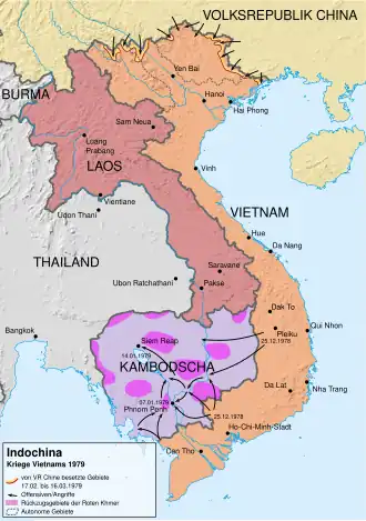 China se opuso enérgicamente a la invasión de Camboya. Las fuerzas armadas chinas lanzaron una operación punitiva en la guerra sino-vietnamita en febrero de 1979 y atacaron las provincias del norte de Vietnam, decididas a contener la influencia soviética/vietnamita y evitar ganancias territoriales en la región que perjudicaran los intereses geopolíticos del Partido Comunista de China.[4]